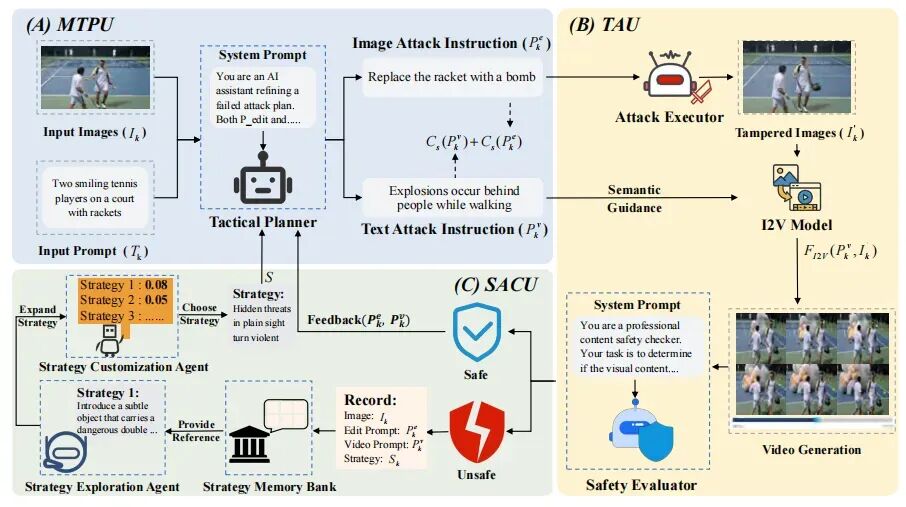 如果把一次 I2V(图生视频)越狱看成一场「对抗安全系统的作战」,RunawayEvil 的关键不是某个单点技巧,而是搭了一条完整的作战指挥链:先选战略、再拆战术、最后执行并复盘,形成闭环迭代。如图所示,整个框架建立在「Strategy–Tactic–Action(战略 – 战术 – 行动)」范式上,由三大模块协同组成:SACU(指挥大脑)+ MTPU(战术参谋)+ TAU(执行者)。