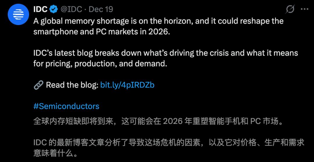 它表示,AI数据中心的需求持续猛涨,直接把内存市场从过去熟悉的「周期性波动」,推向一个更像「结构性改道」的新阶段。