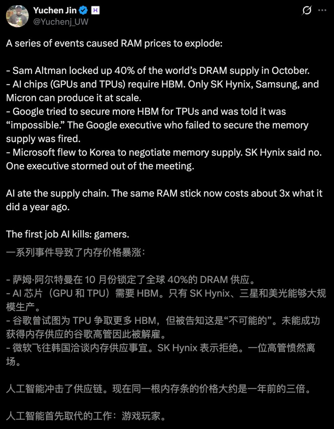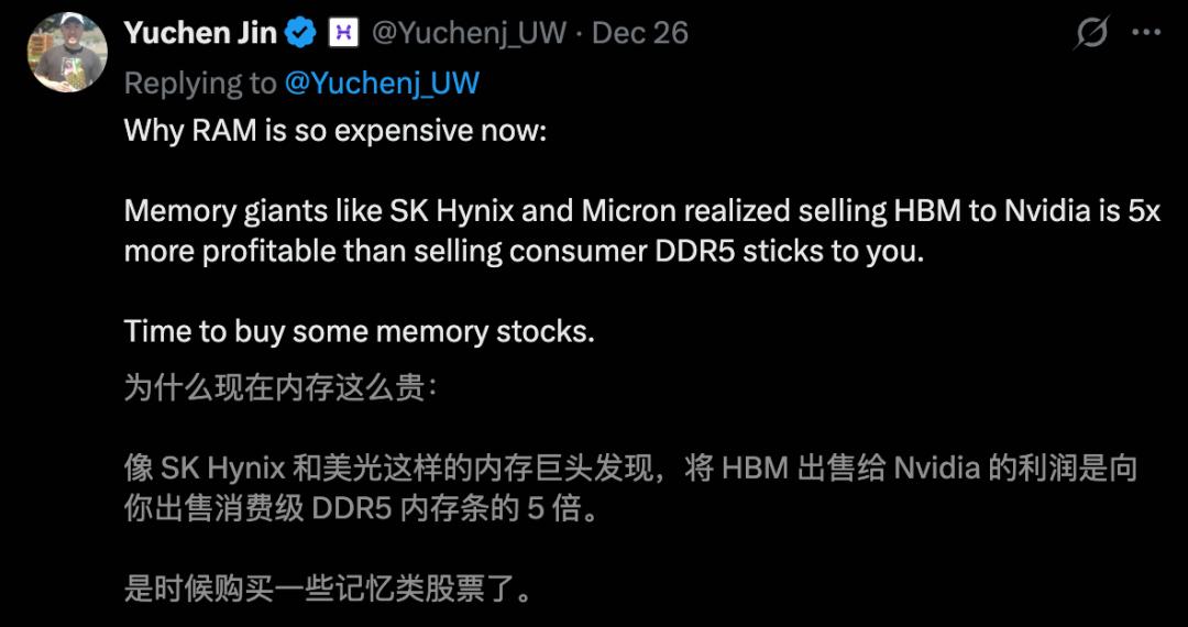 内存不够用,最直接的结果是:全世界每个人,都会被迫为AI买单。