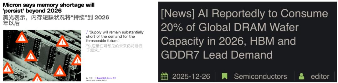最关键的是,这种内存短缺的状况,还将持续到2026年以后。而且,AI就占用了全球20% DRAM晶圆产能。