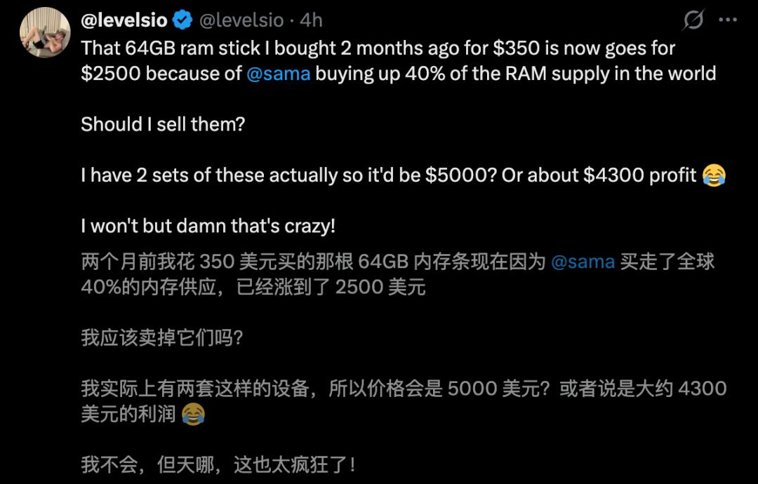 就是因为有消息说,奥特曼买走了全球40%的内存供应……