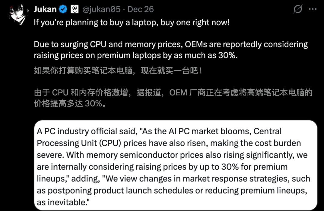 多家PC大厂已经释放信号:成本压力会在2026年下半年进一步抬升。