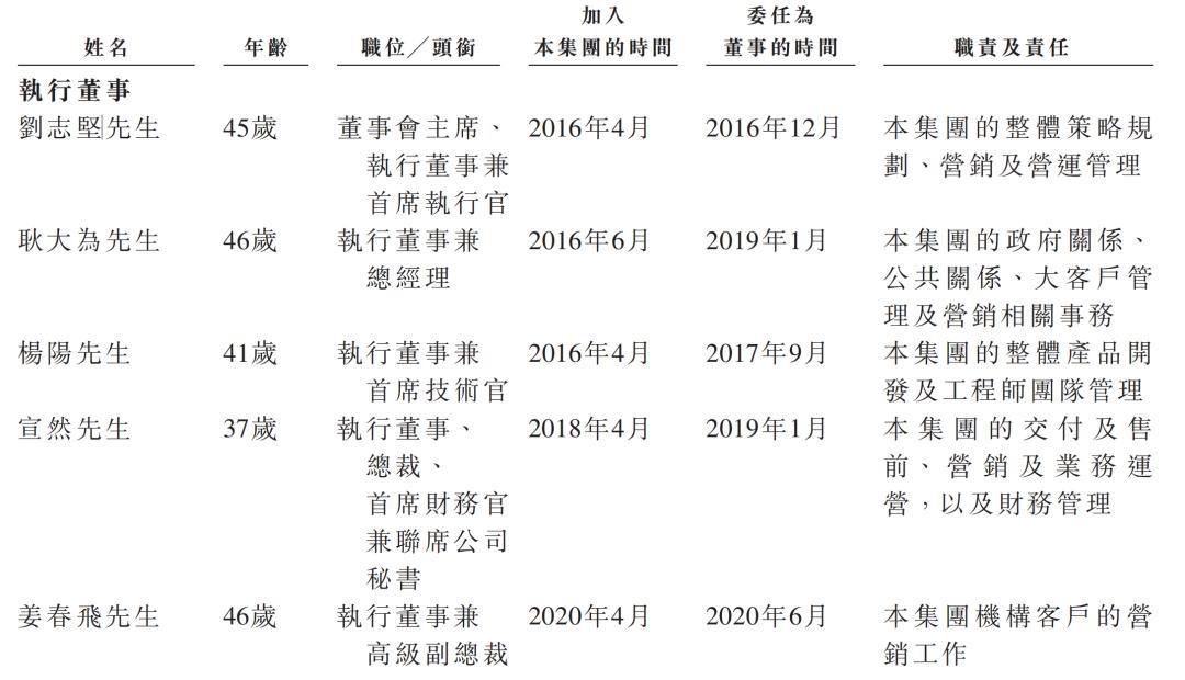 刘志坚,45岁,担任该公司董事局主席、CEO,主要负责集团的整体战略规划、市场营销及运营管理。他于2004年在清华大学取得电子科学与技术学士学位,2006年在香港获得香港科技大学电机及电子工程硕士学位。在创办本公司前,刘志坚曾在苏格兰皇家银行担任董事,而后担任了国开国际投资有限公司的执行董事。