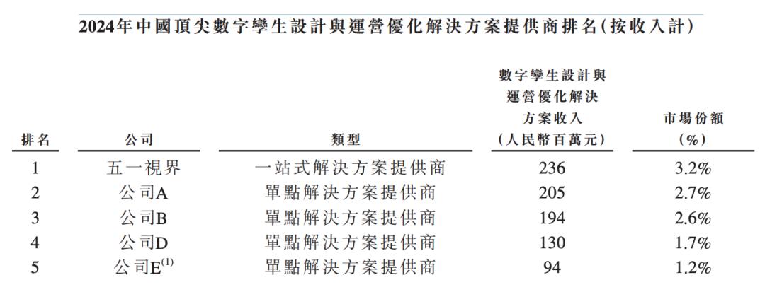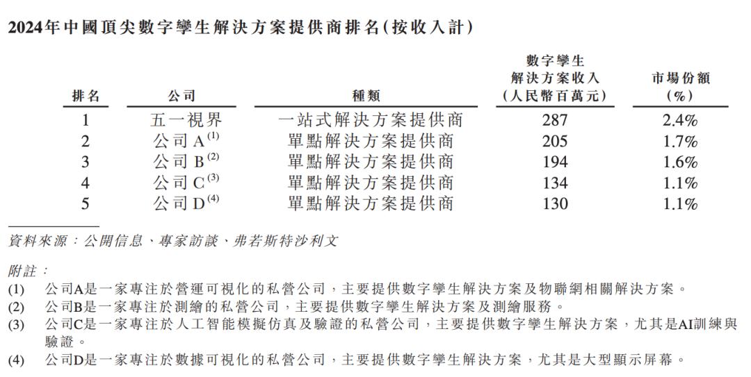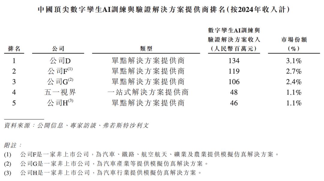根据弗若斯特沙利文的资料,51WORLD是中国领先参与者中唯一的一站式解决方案提供商,在3D图形、物理模拟仿真、AI方面均已进入商业化阶段。51WORLD在数字孪生市场的融资规模第一,是该行业首家实现年收入超2.50亿港元(约合人民币2.25亿元)的公司。