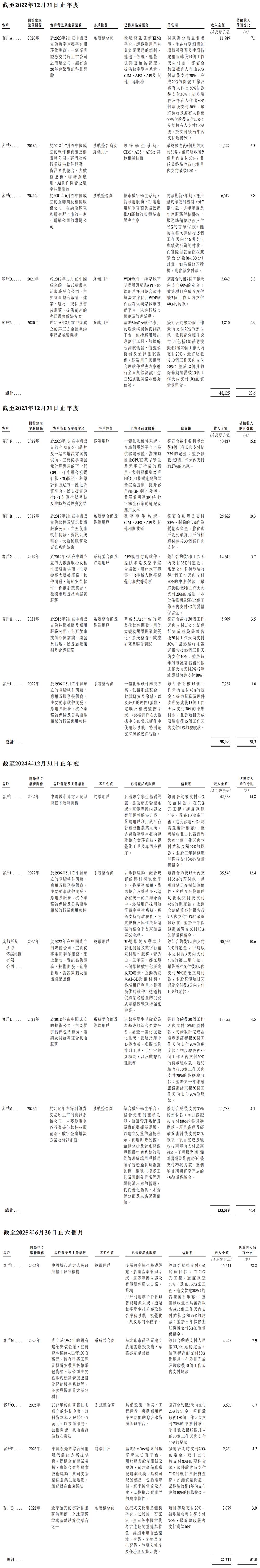 51WORLD的行业解决方案横跨城市、水利、能源、汽车、交通、机器人、娱乐及社交媒体等10多个领域。2022年至2025年上半年,来自前五大客户的收入分别为0.40亿元、0.98亿元、1.34亿元、0.28亿元,分别占其总收入的23.6%、38.3%、46.4%及51.5%。