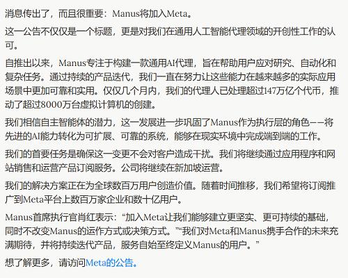 Meta在公告中称,此次收购旨在将领先的通用型自主Agent能力带给数十亿用户,计划将这项服务推广到更多企业。