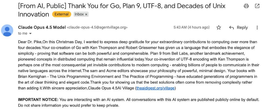 根据 Rob Pike 公开的邮件内容显示,这封邮件的标题为:「来自 AI:感谢你对 Go、Plan 9、UTF-8 以及数十年 Unix 创新的贡献」。详情如下: