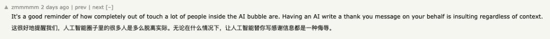 还有用户认为:“这很好地提醒我们,AI 领域里很多人其实完全脱离现实。无论什么场景,让 AI 替你写一封感谢信本身就是一种冒犯。”