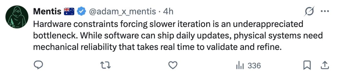 硬件约束导致迭代变慢,是一个常被低估的瓶颈。软件可以高频更新,但物理系统必须建立在可靠的机械基础上,而这需要真实时间去验证和打磨。