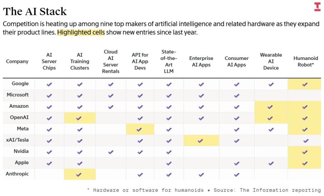 可以看到几乎所有公司都在致力于构建更完整的AI「技术栈」,以此提升自身地位。