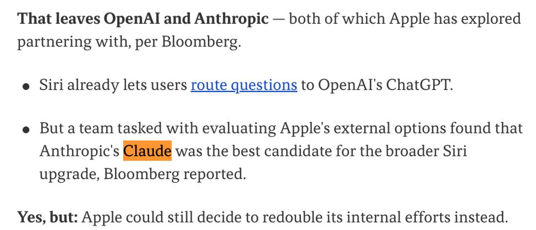 据彭博社和多方消息源透露,苹果的工程团队实际上更倾向于Anthropic的Claude模型。