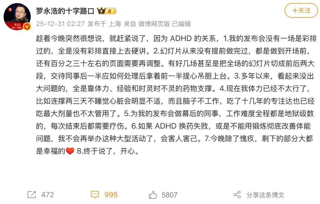 在迟到了 40 分钟之后,老罗终于在 2025 年的最后一天,站上了科技春晚的舞台。对那些枯等了许久的现场观众,他给到的除了免票,还有一个「理由」:ADHD。