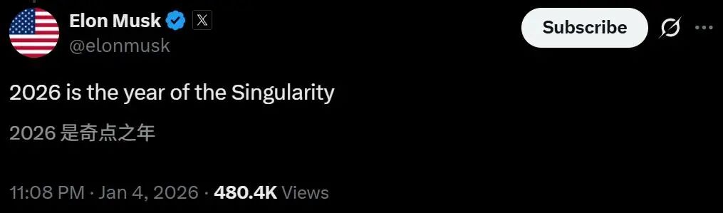 马斯克在 X 上连发两条内容,直接放话 2026 就是奇点之年。
