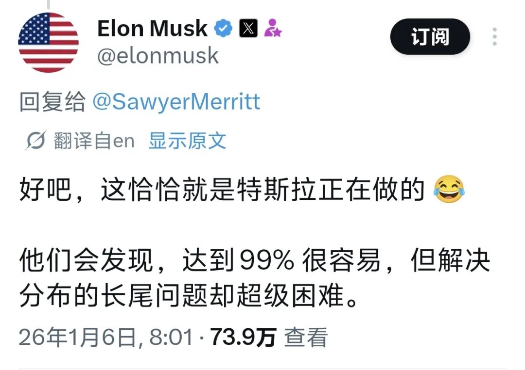 随后,特斯拉CEO马斯克在X上指出,这正是特斯拉正在做的,他们会发现,达到99%的准确率很容易,但要解决分布的长尾部分超级难。