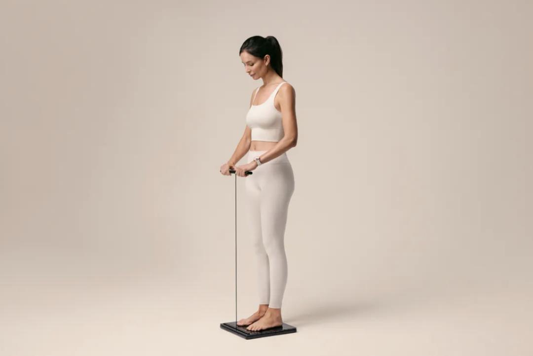 这台秤的外形很有仪式感:钢化玻璃面板上方连着一根像引体向上杆一样的拉杆。当你站在上面,把拉杆拉到臀部位置,维持大约 90 秒,这期间不仅有底座的 8 个电极在工作,手柄上的 4 个不锈钢电极也会同时介入。这阵势不是为了测体重,而是为了捕捉 60 多种生物标志物。最让我吃惊的是,它竟然能像医疗设备一样,在不用血压袖带的情况下评估高血压风险,甚至能捕捉到血糖调节失调的早期信号。