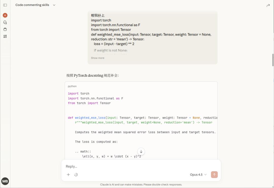 甚至你只给它一段 PyTorch 函数代码,啥也不说,就说“帮我补上”,它就能参考 Docstring 技能里的规范,帮你补上符合 PyTorch 官方标准的 docstring,再也不用被代码规范困扰了。