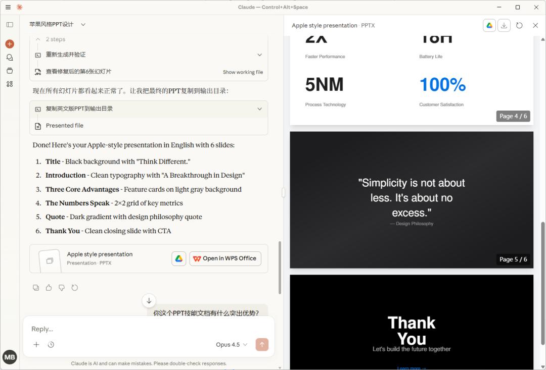 比如,我可以直接让它做一个苹果公司风格的PPT,而它的技能文档,会指导它直接用 HTML+CSS 写幻灯片,所见即所得,然后再自动转换成原生PowerPoint格式,在线预览一键导出。