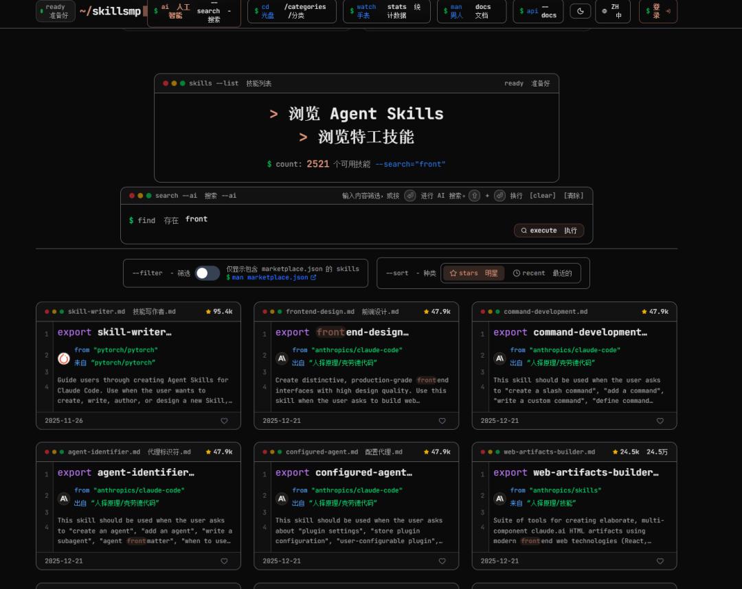 因此,你可以从社区里薅到不少大佬分享的技能包,比如这个叫Skillsmp的网站。