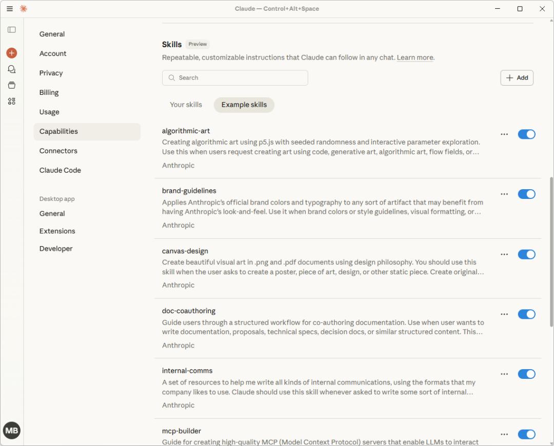 然后你会发现,它已经内置了很多基础技能了,像什么文档处理,网页设计等等。