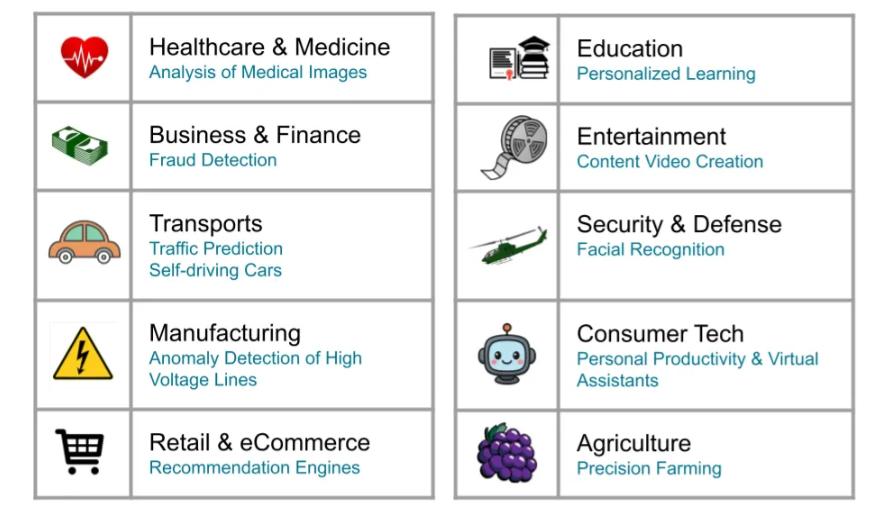 除了医疗保健领域的医学图像分析、商业和金融领域的欺诈检测、交通运输领域的交通预测和自动驾驶汽车、制造业领域的异常检测、零售和电子商务领域的推荐引擎、教育领域的个性化学习、娱乐领域的内容创作、安全和国防领域的面部识别、消费科技领域的个人生产力工具和虚拟助手,甚至农业领域的精准农业……人工智能究竟为我们做了什么?