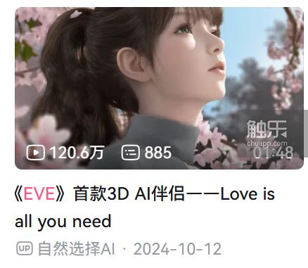 《EVE》算是国内动作最快的新AI陪伴产品。2024年10月,它以“首款3D AI伴侣”为卖点,在B站发布宣传PV,播放量超过百万。《EVE》研发公司的创立者北海也是跨界创业者,他做过社交产品,也是恋爱手游《奇点时代》的制作人。有趣的是,2025年4月,团队曾基于游戏《奇点时代》推出衍生AI情感陪伴产品《奇点Chat》。但后来,他们认为女性用户对情绪价值对话和陪伴功能感知力更明确,决定先做女性向版本。
