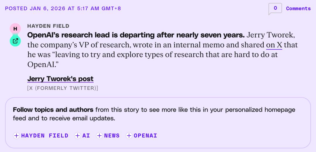 新年第一弹,OpenAI研发副总裁Jerry Tworek官宣离职,这位七年老兵给出的理由让人细思恐极:想做在OpenAI做不了的研究。从Dario Amodei出走创立Anthropic,到Ilya政变后离开,再到安全团队负责人摔门而出——OpenAI的核心大脑们正在以惊人的速度流失。