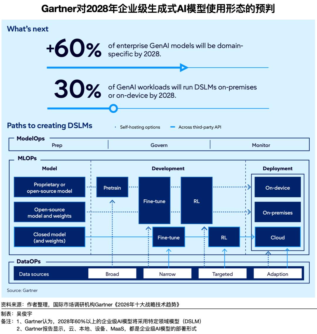 国际市场调研机构Gartner在《2026年十大战略技术趋势》给了一个更全面的解释——2028年60%以上的企业级AI模型将采用特定领域模型(DSLM)(根据特定数据集训练的AI模型,准确性、合规性更高),它们可能同时通过云、本地、设备、MaaS部署。