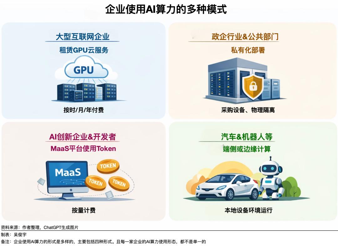 目前,使用AI算力的形式非常多样——通过公共云租赁GPU部署模型、采购GPU服务器进行模型私有化部署后进行后训练或强化学习、MaaS平台调用Token、端侧算力部署模型等都是主流方案。