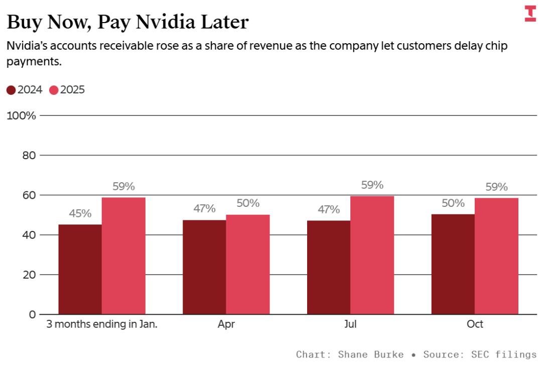 2024–2025年间,英伟达应收账款占收入比例持续上升。