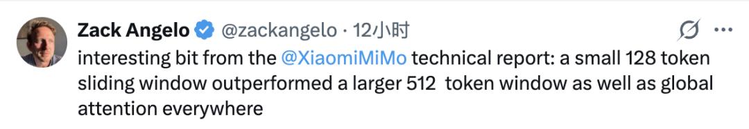 有细致的网友从技术报告中发现,小米的滑动窗口大小只有128k,但效果比512k的大窗口还要好。