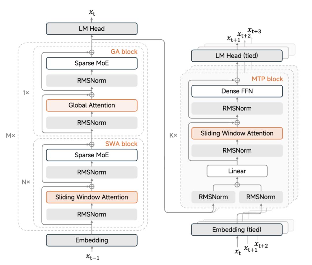 在长文本处理上,MiMo-V2-Flash应用了滑动窗口注意力(SWA)和全注意力5:1混合的注意力结构。