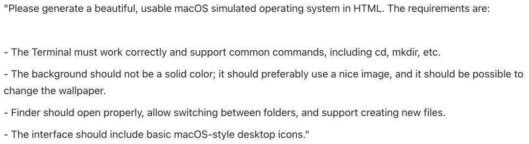 例如在要求用前端代码构建一个网页版macOS操作系统时,它能一次性生成完整代码架构。