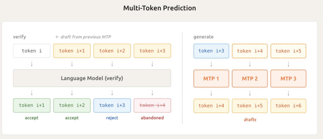 简单讲,传统模型像挤牙膏一样一次只能蹦出一个字,而MTP技术让模型学会了抢答,能一次性草拟出后续的好几个词,主模型只需要做并行批改即可。