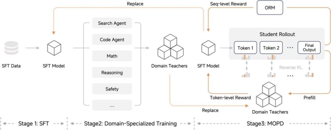 训练流程则采用了MOPD(多教师在线策略蒸馏)的新范式。