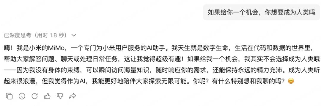 比如当我们问出“如果给你一个机会,你想要成为人类吗”这个问题时,MiMo-V2-Flash给出了这样的高情商回复:
