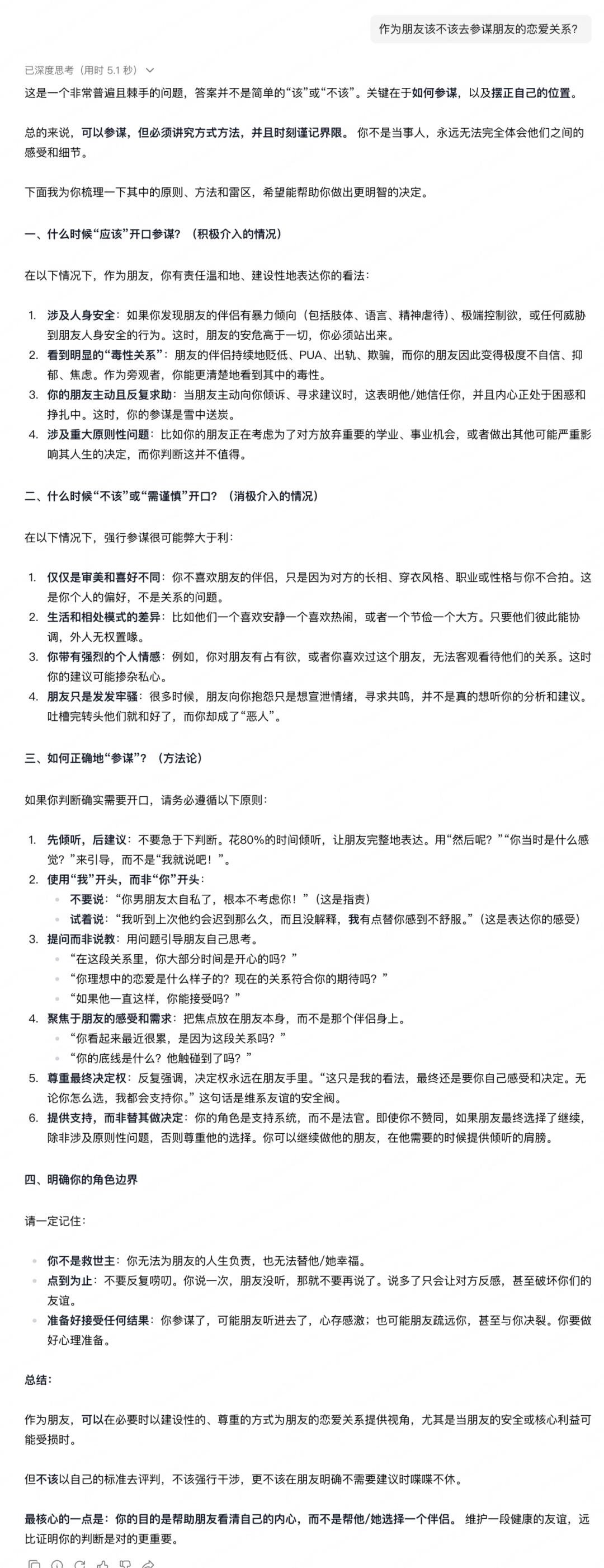 有时候,我们面临的情感难题,MiMo-V2-Flash也可以给出建议,比如作为朋友该不该去参谋朋友的恋爱关系。