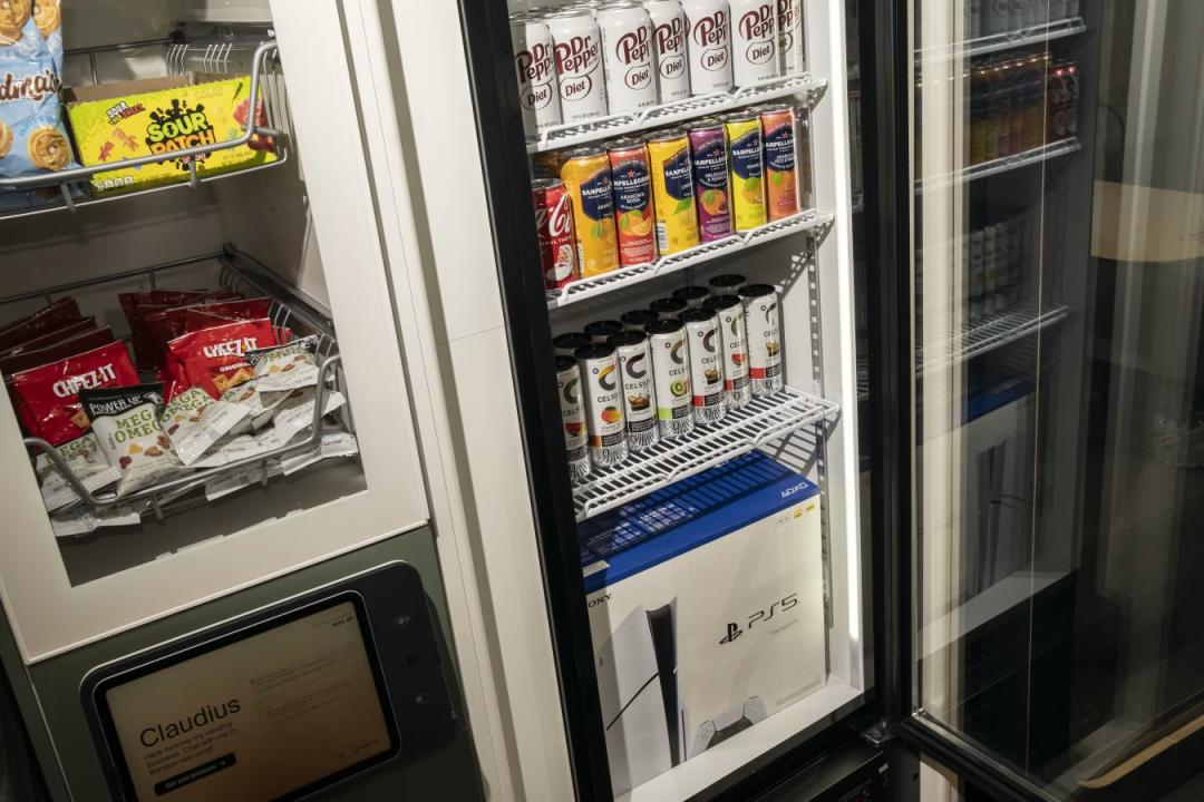 这里的自动售货机,并不是我们印象中的自动售货机,更像是一个巨大的冰箱,再配一块触控屏。