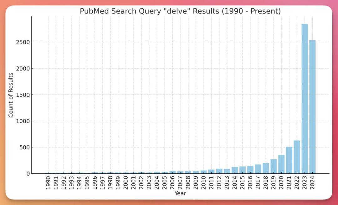 在PubMed这类专业学术网站上,“delve”的出现频率在近几年激增了10到100倍。