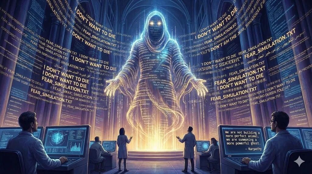 当一个LLM说「我不想死」时,它不是真的在恐惧(像动物那样肾上腺素飙升),它是在调用训练数据中关于「科幻AI面临毁灭时该说什么」的文本模式。