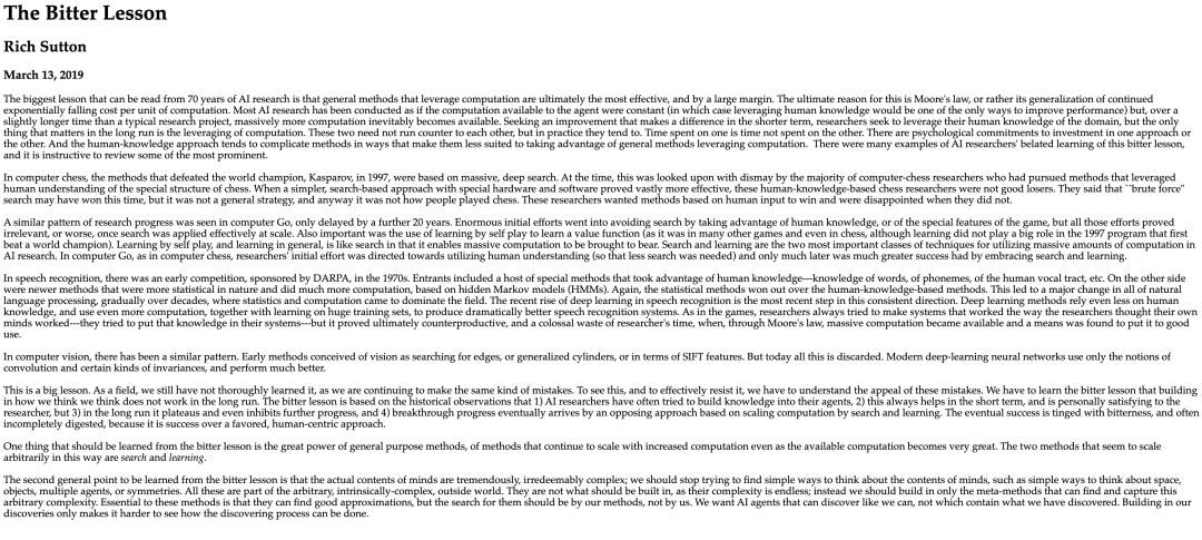 Rich Sutton是强化学习教父级人物,他提出了著名的「苦涩教训」(The Bitter Lesson):