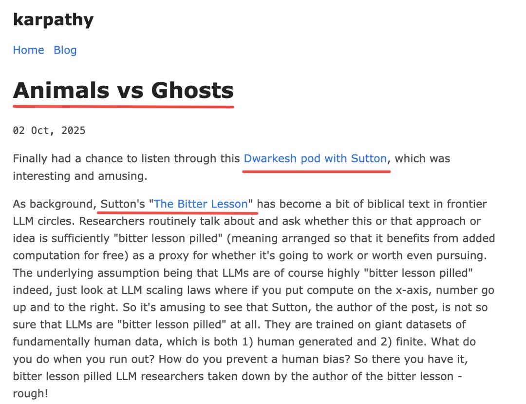 在深入技术细节之余,Karpathy通过引用AI先驱Rich Sutton的对话,抛出了一个极具哲学深度的议题:Animals vs. Ghosts(动物与幽灵)。