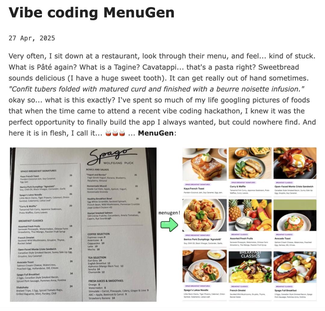 Karpathy为了验证这个理论,亲自上手做了一个叫MenuGen的项目。
