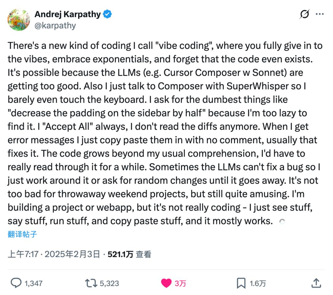 就是你完全放弃对代码细节的掌控,「把自己交给氛围(Vibes),拥抱指数级增长,甚至忘掉代码的存在」。
