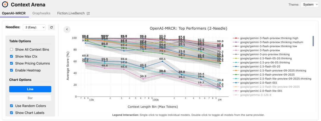 Context Arena不仅仅是一个排行榜,它是一个针对大模型「注意力缺陷」的诊断工具看,衡量模型「智商」和长程记忆稳定性的试炼场。