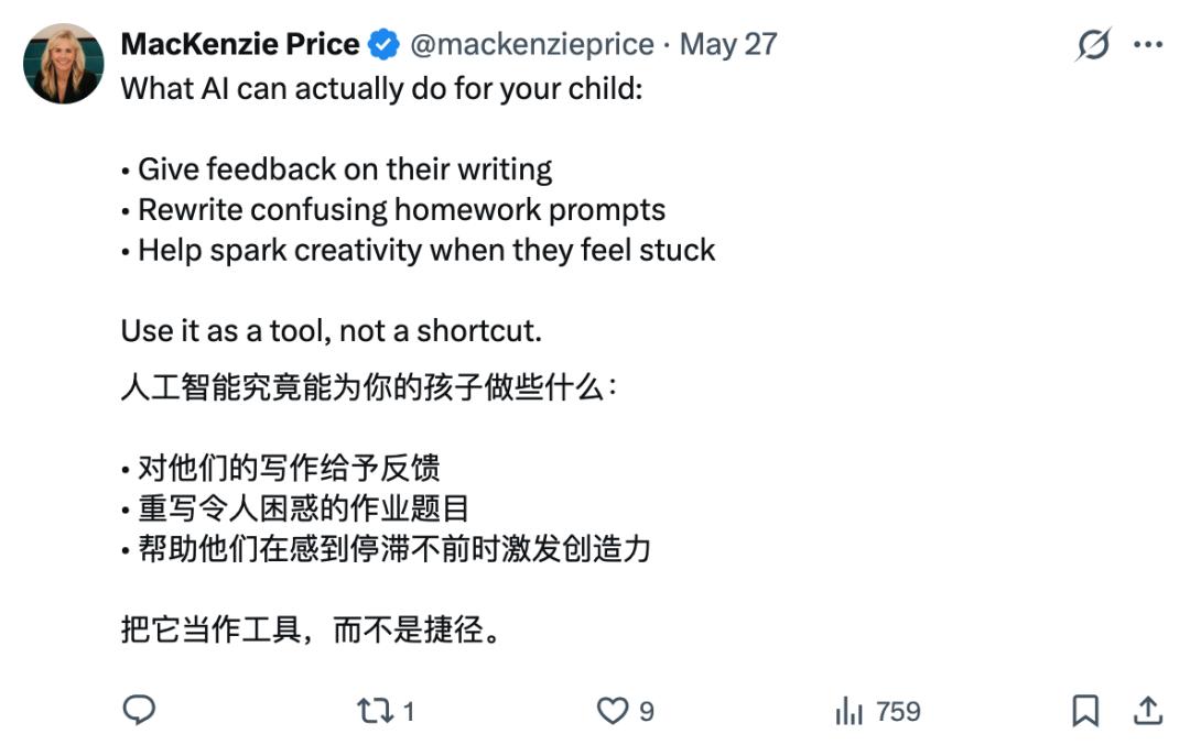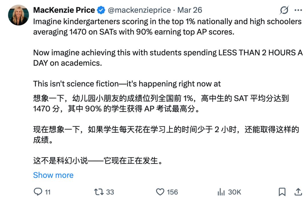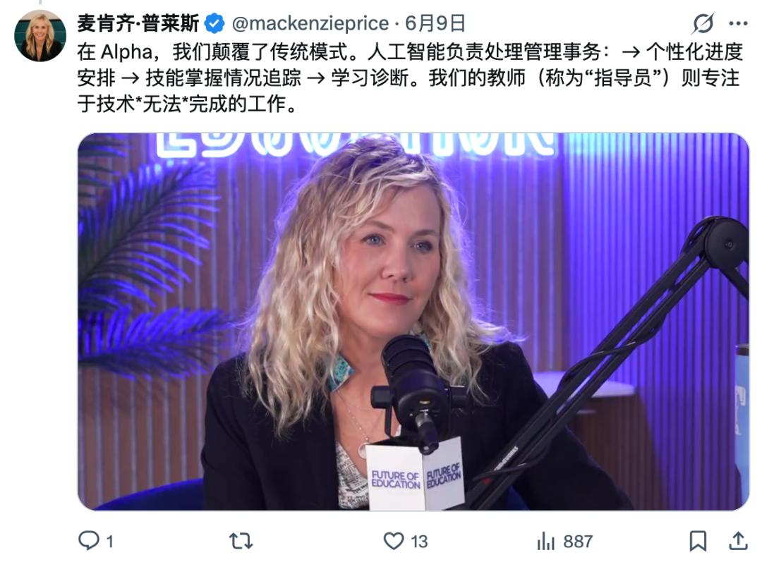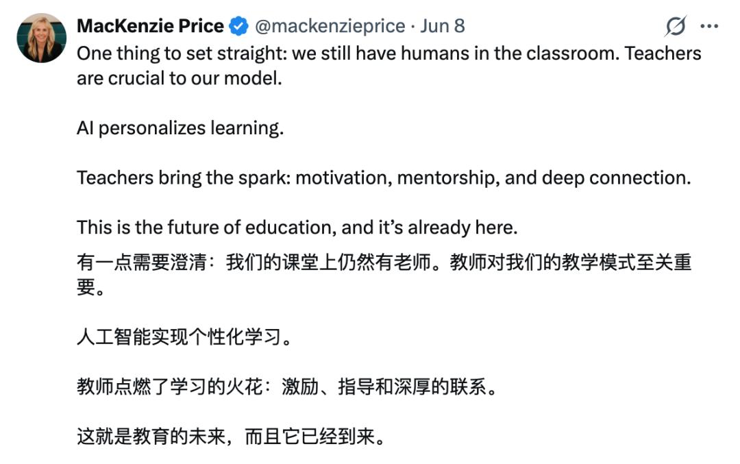 Alpha School 的联创麦肯齐·普莱斯说过一句话,或许可以作为这篇文章的收尾: