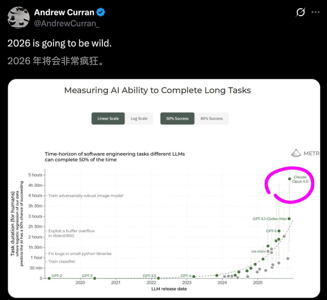 在METR最新公布报告称,Claude Opus 4.5已能够持续自主编码「长达5小时不崩」。